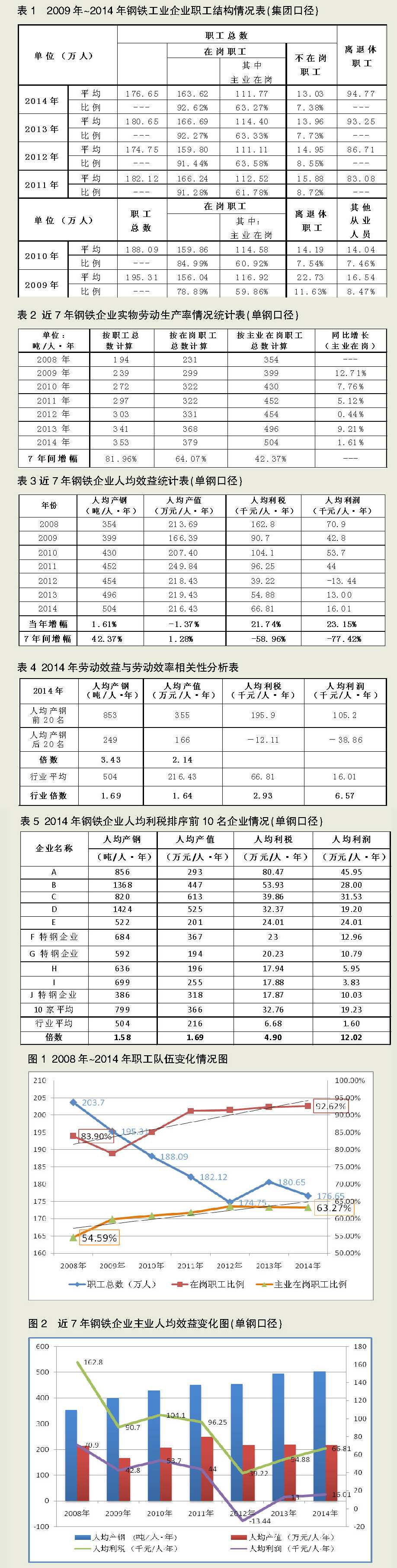 表2显示,2014年,按单钢口径计算,会员企业生产粗钢总量为5.64亿吨,按职工总数160万人计算,则人均年产钢约为353吨;按在岗职工149万人计算,则人均年产钢约为379吨;按主业在岗职工112万人计算,则人均年产钢约为504吨。从2008年到2014年的7年间,按职工总数、在岗职工人数、主业在岗职工人数计算,实物劳动生产率分别增长了81.96%、64.07%、42.37%。数据充分显示,钢铁行业人力资源工作者通过积极的人力资源结构优化工作,实物劳动生产率明显提高。
